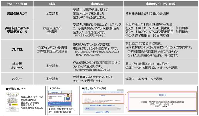 受講完了までのサポート内容を知りたい 電話やメッセージ送信、ハガキ送付など、さまざまな方法で、受講対象者を受講完了まで導きます。 <受講者への一斉連絡>●受講ページの「掲示板」からメッセージ送付●受講ページの「アバター」が励ましメッセージを発信●受講促進ハガキをご自宅に送付<特に取り組み状況が芳しくない受講者への連絡>●課題未提出者対象:受講促進メールの送付●未ログイン者・課題未提出者対象:お電話での状況確認 実施内容やタイミングは下記をご参照ください。