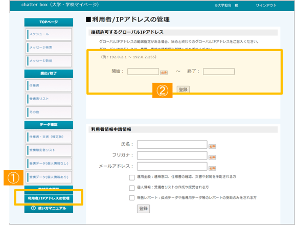 ①「利用者/IPアドレスの管理」のボタンを押下すると、利用者/IPアドレスの管理画面が表示されます。