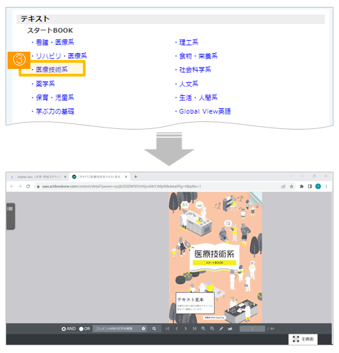 ② 閲覧したい教材種類をクリックすると、すべての教材名が表示されます。