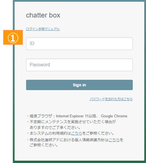 ①ID、Passwordを入力し、「Sign in」をクリックしてください。※ID、初期パスワードは初回登録時にメールで通知が届きます。