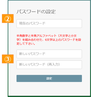 ※初回ログイン時はパスワードの設定を行います。「新しいパスワード」と「新しいパスワード(再入力)」に任意のパスワードを入力し、「設定」ボタンをクリックしてください。