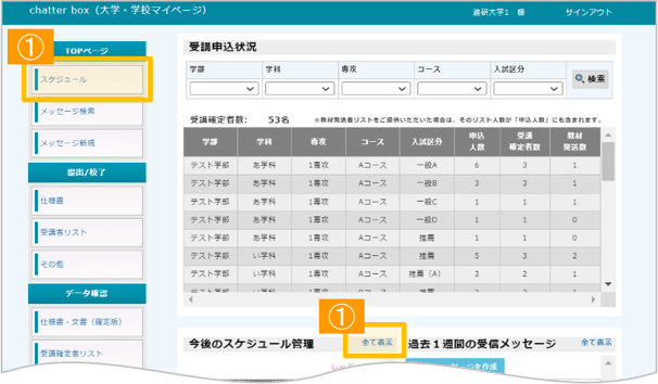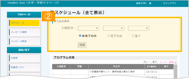 ②「絞り込み条件」より入試区分と「未完了のみ」「完了のみ」「全て」で選択、クリックすると運用スケジュールの一覧が表示されます。