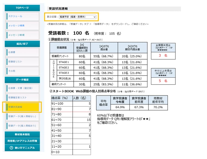 ※複数学部・学科でご採用の大学・学校様については、表示切替より、での該当の学部学科をご選択いただくことで、該当の学部学科ごとの状況をご確認いただくことが可能です。