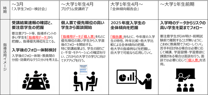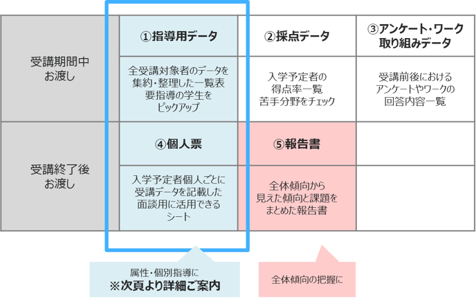 ご提供データは5種類あり、大学・学校のスケジュールに合わせて、適切なタイミングでご提供・ご報告をいたします。