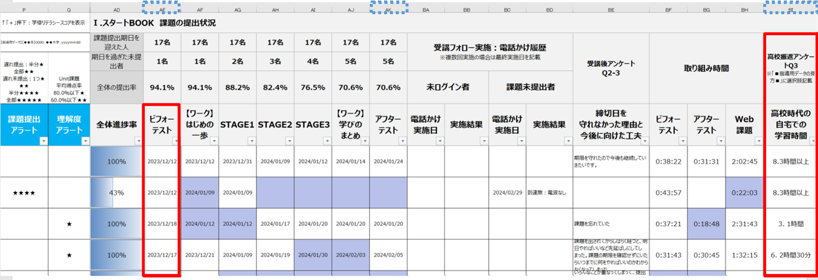 となり、ビフォーテスト(列AE)、アフターテスト(列AK)には、各自が課題を終えた日付が記載されていきます。教材を発送後、受講をきちんとスタートしているかを確認するためには、下記にご着目ください。