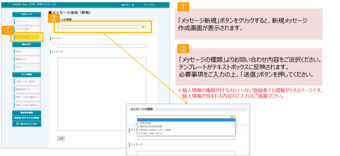受講対象者から大学・学校へ直接問い合わせがあった場合は、chatterboxの「メッセージ」もしくは進研アド教育事業本部までお問合せ下さい。