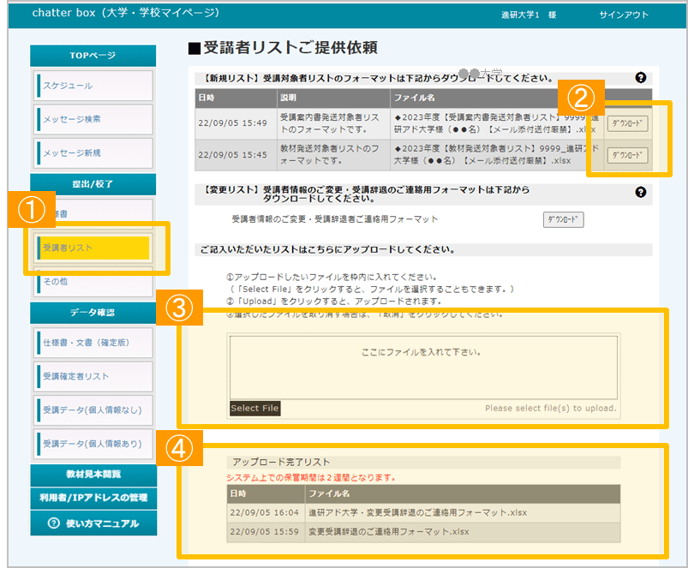 「受講者リスト」からフォーマットをダウンロードのうえ記入いただき、記入済みファイルを同ページへアップロードしてください。