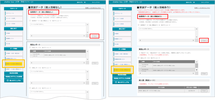 Chatterboxの「データ確認」より、ご確認・ダウンロードが可能です。個人の氏名が入った「個人情報あり」のデータと、氏名が入っていない「個人情報なし」のデータ、2種類ございます。ご入学生の受講期間中、毎日、最新のデータをアップロードしております。