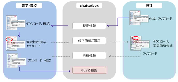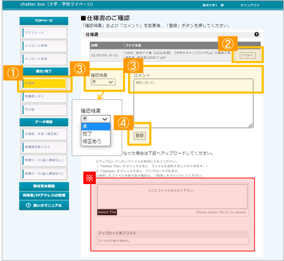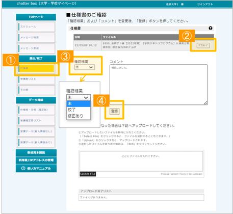 ※2一度「校了」登録を行うと、確認結果とコメント欄は入力不可となり、ファイルアップロードボックスも表示されなくなります。再度仕様書を変更される場合は、新規メッセージよりお問い合わせください。