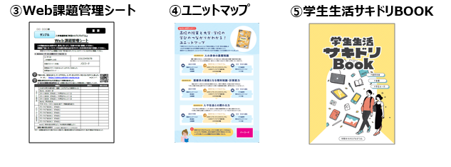 「テキスト」「学び方ガイド」「Web課題管理シート」「ユニットマップ」「学生生活サキドリBOOK」をお届けします。